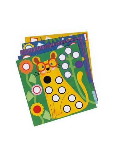 10 illustrations aux couleurs de la collection Les Toupitis à compléter avec les 300 gommettes géométriques incluses. Un jeu de formes et de couleurs où les contours colorés guident les enfants à réaliser de jolies œuvres.