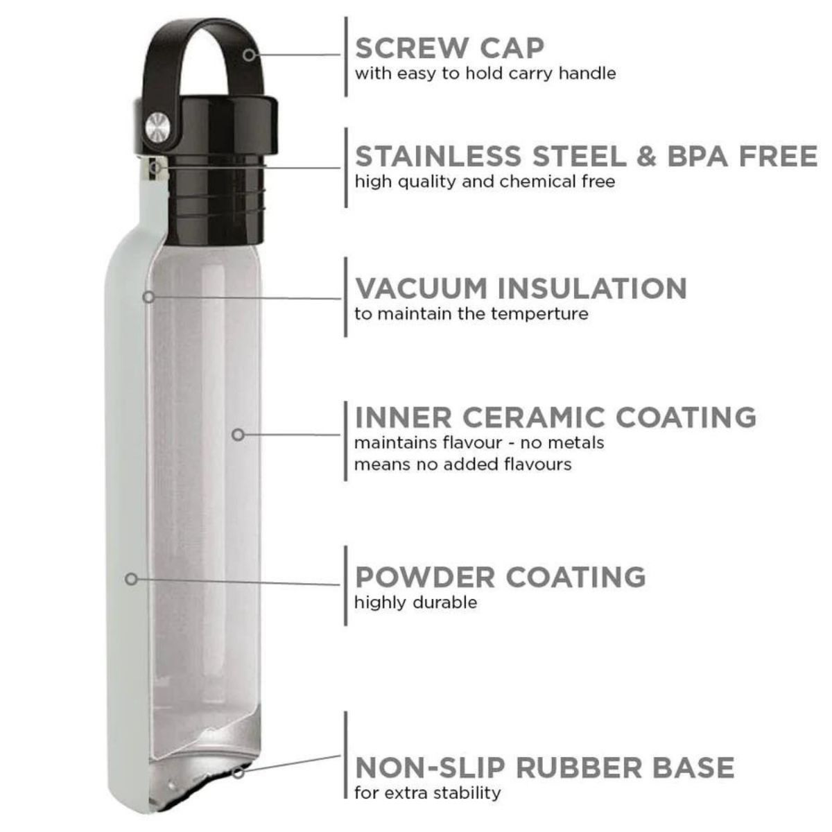 Léger et mince, doté d'une base en caoutchouc antidérapante, d'un bouchon à vis et d'une poignée flexible pour une portabilité facile. Comme pour toute la gamme Runbott, la vraie magie est à l'intérieur grâce à leur revêtement en céramique unique.