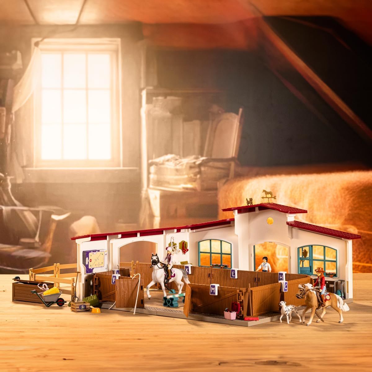 Contenu : 1 Bâtiment de manège équestre, 3 figurines entièrement articulées, 2 chevaux, 1 dalmatien, 1 chaton et 89 accessoires.