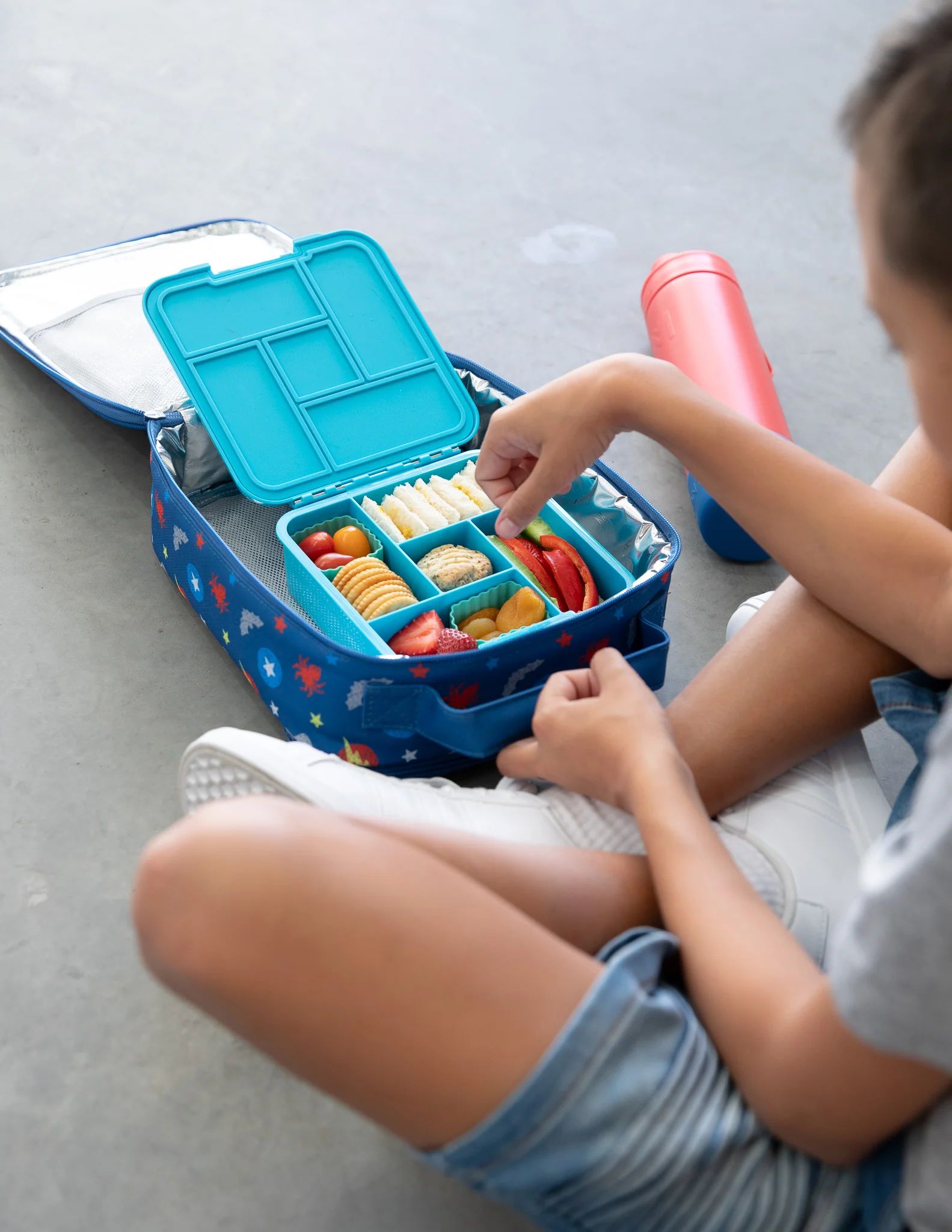 Mettez votre boite à tartines ainsi que votre gourde dans la grande poche et elles resteront au frais grâce à la pochette réfrigérante incluse dans la deuxième poche de votre sac. Dans le grand compartiment, vous avez également une petite poche à scratch pour y mettre vos couverts ou des serviettes par exemple.