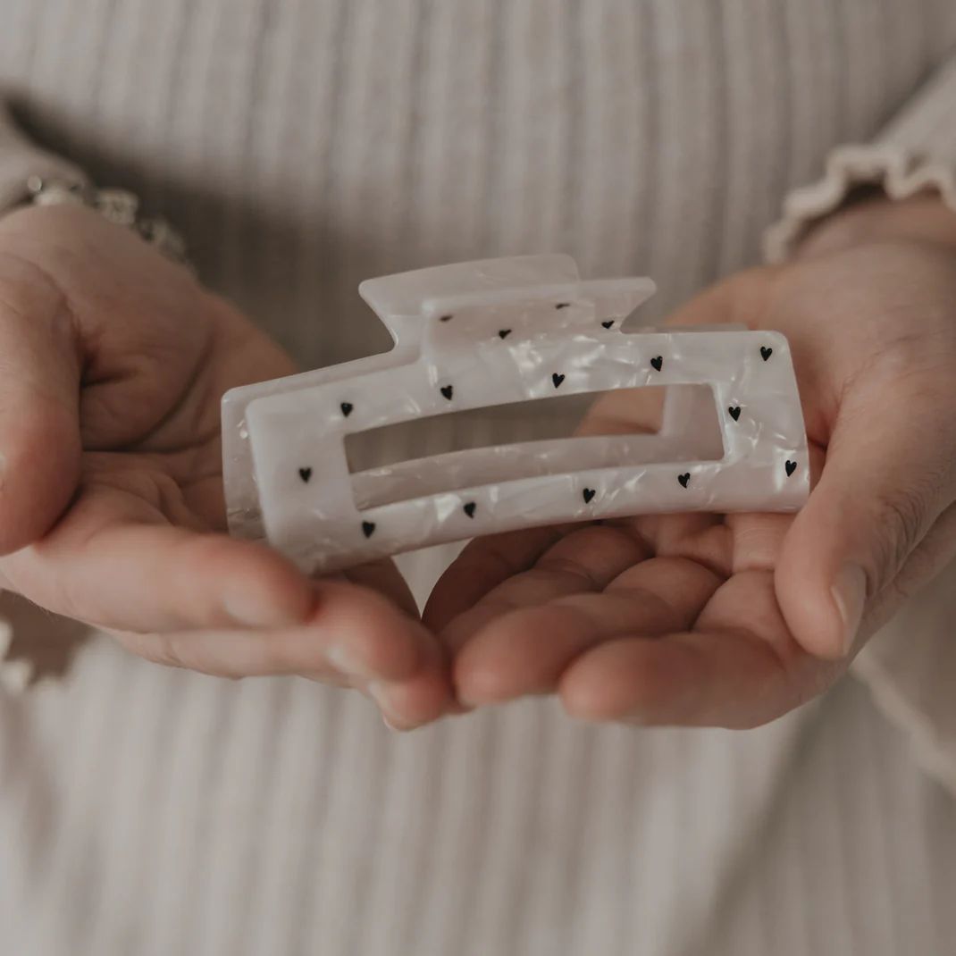 Les motifs "cœurs" apportent une touche de légèreté et de fantaisie, idéale au quotidien comme pour les occasions spéciales. Sa taille généreuse assure un maintien parfait, même pour les cheveux épais ou bouclés.