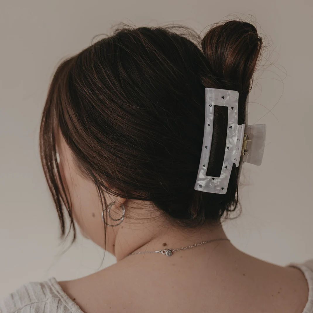 Cette grande pince carrée séduit par ses couleurs douces. L’alliance de teintes nacrées et de motifs noirs délicats confère à votre coiffure une allure à la fois féminine et moderne.