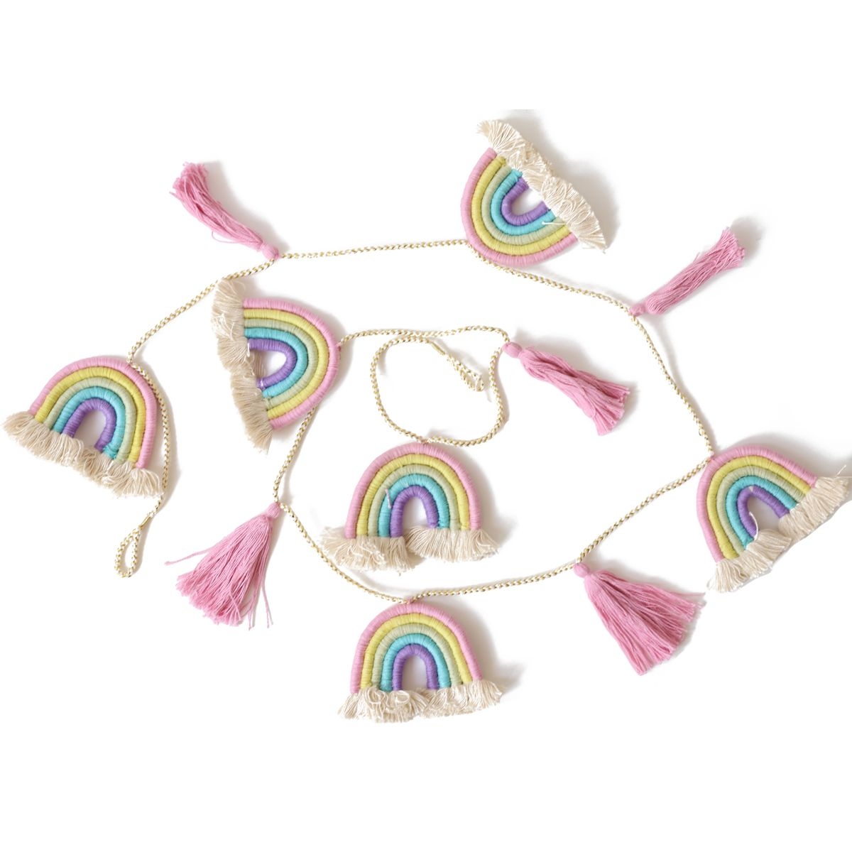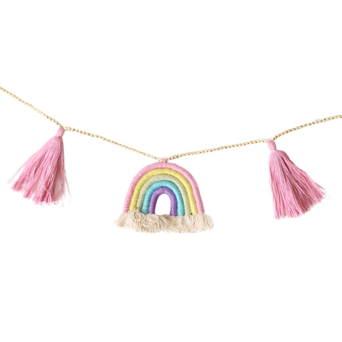Les arcs-en-ciel et les pompons roses en coton s'alternent et composent cette magnifique guirlande aux couleurs douces.