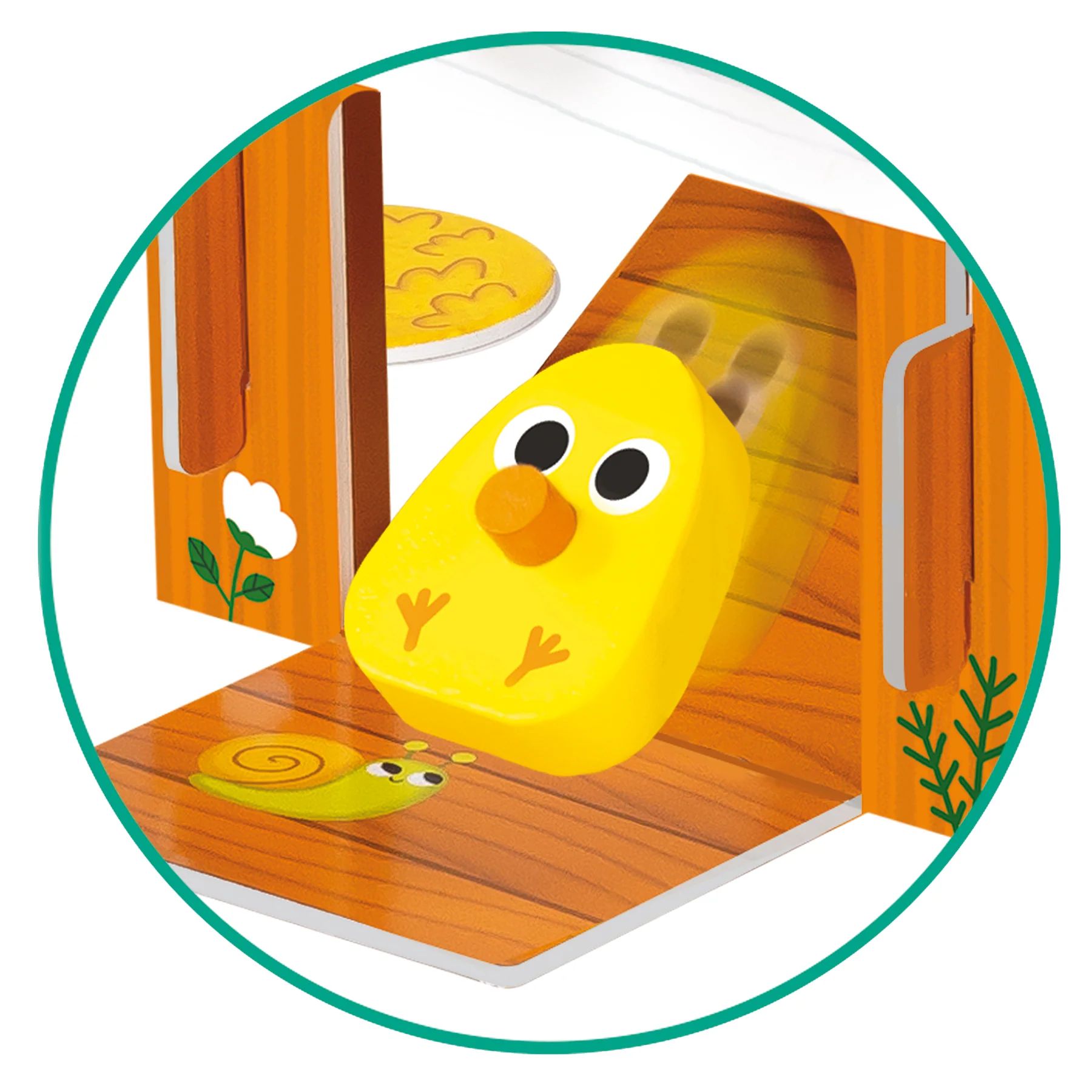 On monte le poulailler, on insère les bâtons dans les trous et on lâche les petits poulets à travers le toit. Chaque joueur à son tour retourne une tuile qui indique la couleur du bâton qu'il peut retirer. Au départ les poulets sont retenus par les bâtons qui quadrillent la maison. Petit à petit ils glissent hors du poulailler par un toboggan pour le plus grand plaisir des enfants. Mais quand une tuile révèle la poule, le joueur doit remettre un poussin dans le poulailler !