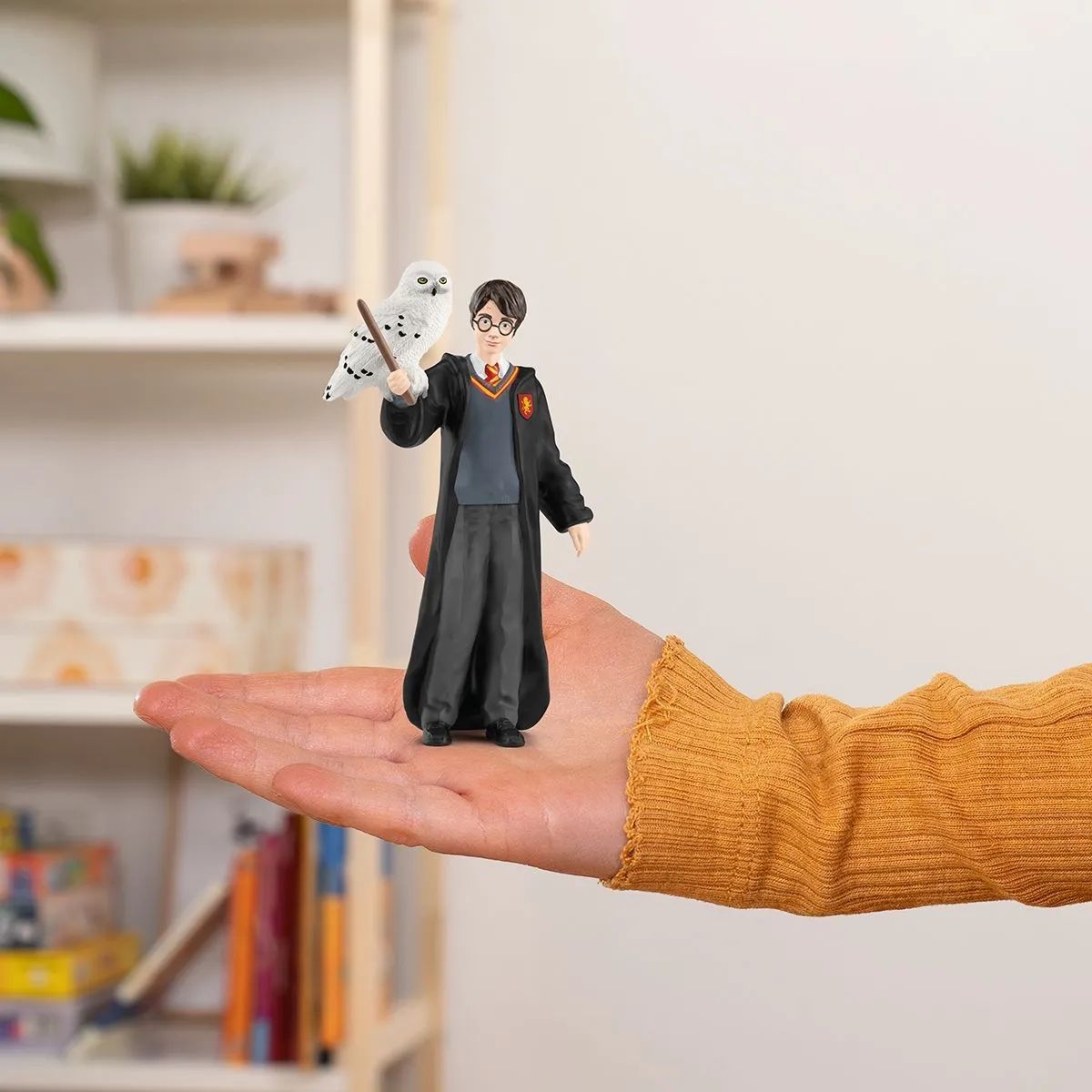 Revêtu de l'uniforme scolaire de la maison Gryffondor, Harry Potter™ tient sa baguette magique et porte ses célèbres lunettes rondes. Où qu'il aille, il est toujours accompagné de sa fidèle chouette Hedwige.