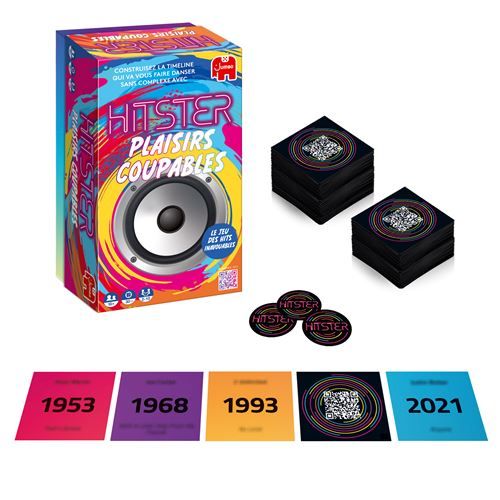 Dans Hitster – Plaisirs Coupables, les joueurs créent leur propre frise chronologique musicale sans la moindre gêne. Après tout, tout le monde a ses petits plaisirs coupables, non ? Le premier à réunir 10 hits devient le grand HITSTER !