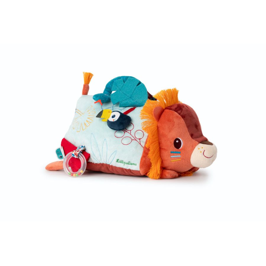 Bébé se met sur le ventre ? Jack le lion aussi ! Pour amuser et éveiller les plus petits, dès 3 mois, notre lion câlin se présente sous forme de triangle d'activités en tissu avec un grand miroir !