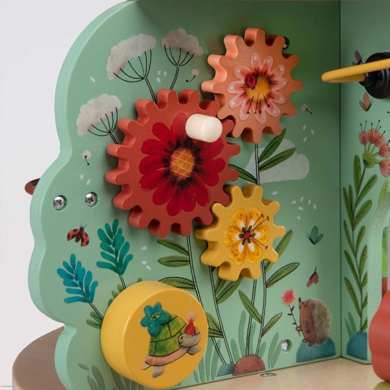 Ce grand jouet en bois d'activités se compose de 4 univers joliment illustrés. Idéal pour l'éveil et les premiers apprentissages des tout-petits avec ses activités : grelot, engrenages, boulier, labyrinthes, miroir, feutrine pour la découverte de la texture.