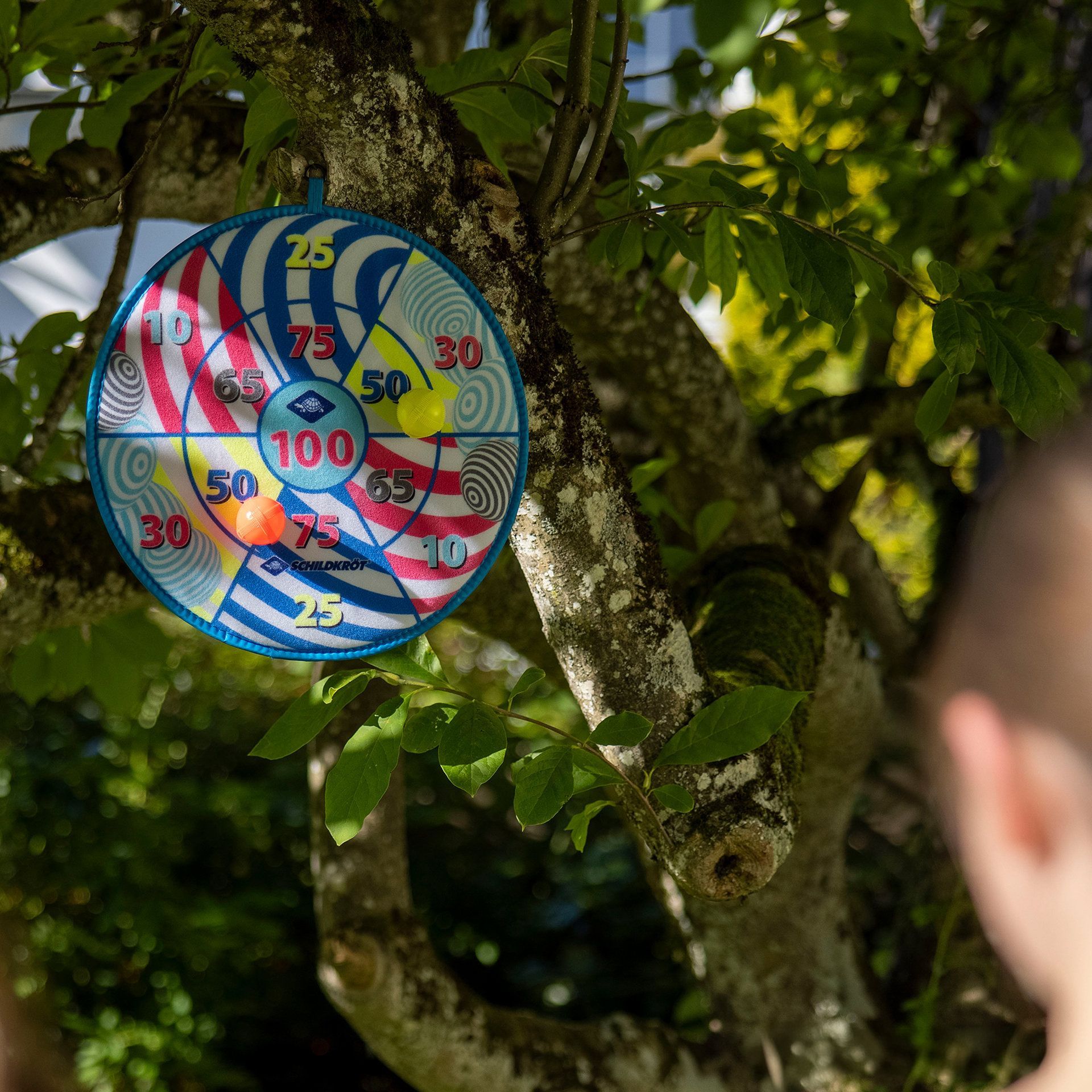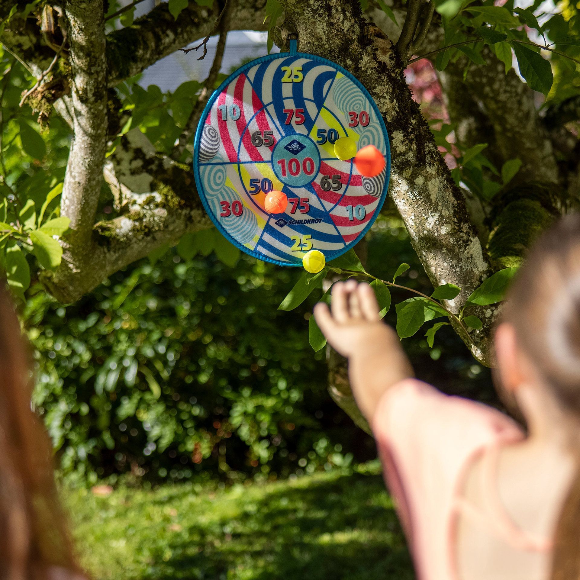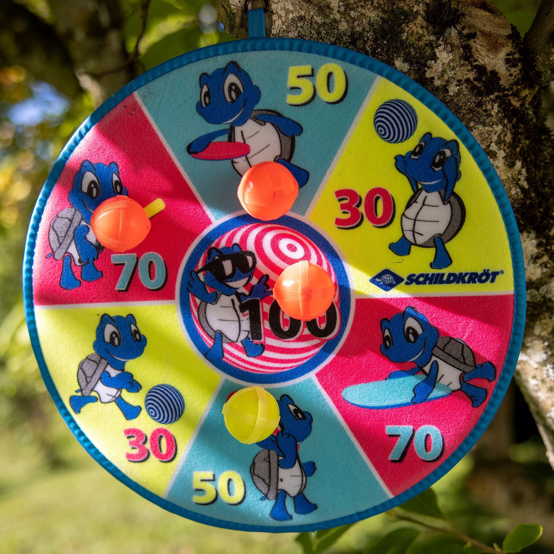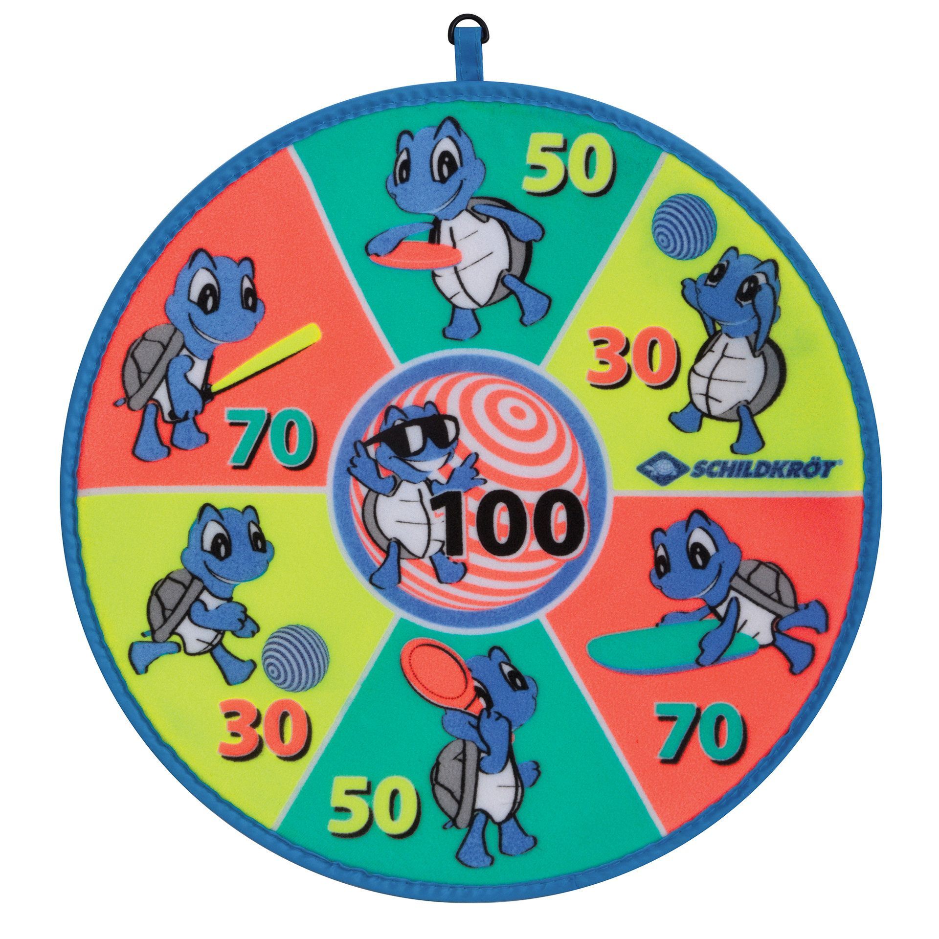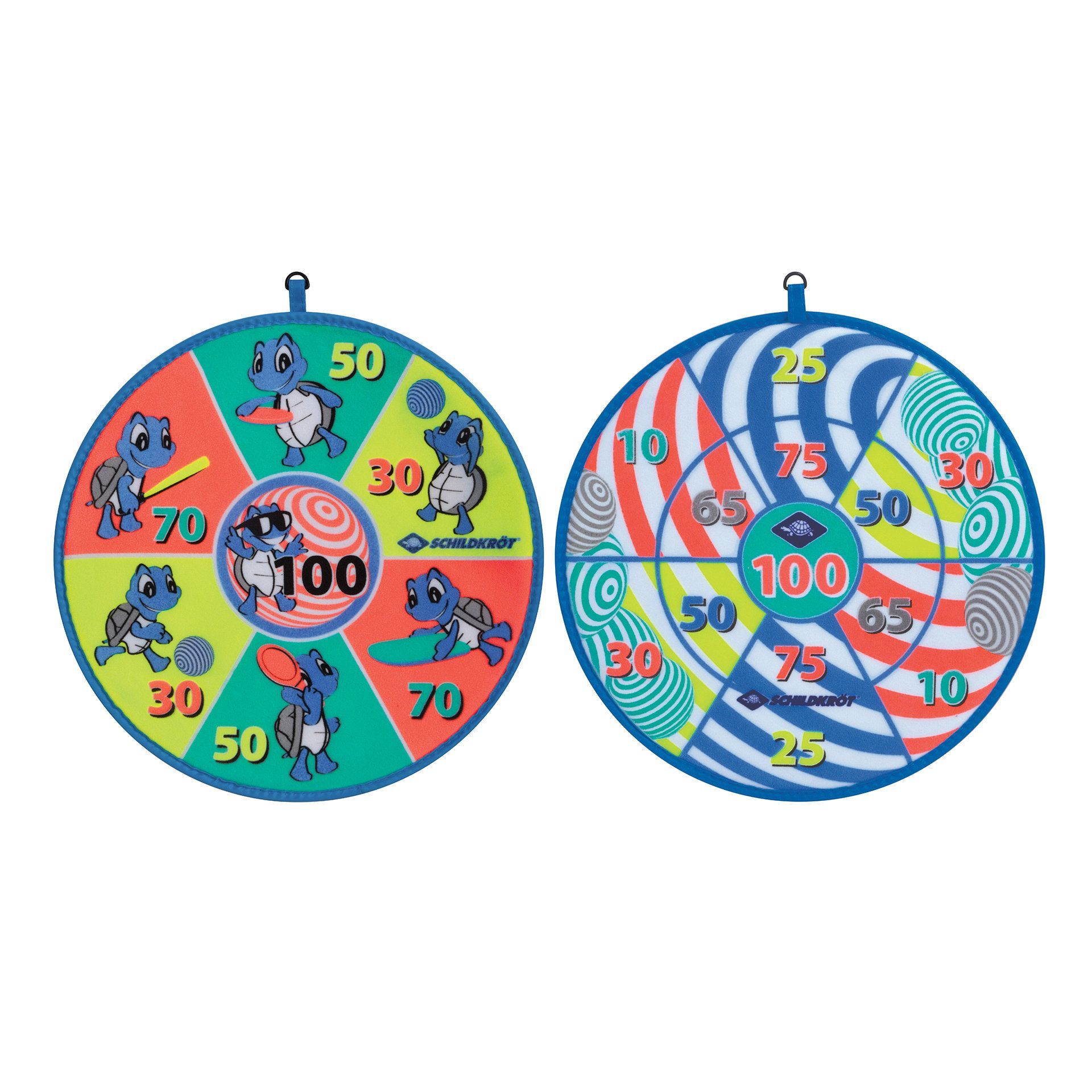 Jeu de fléchettes souples composé d'une cible avec velcro (Ø 38 cm), imprimée de différents motifs recto et verso, et utilisable des deux côtés. Chaque joueur lance alternativement 3 balles Velcro colorées (Ø 4 cm) sur la cible, en essayant d'atteindre le