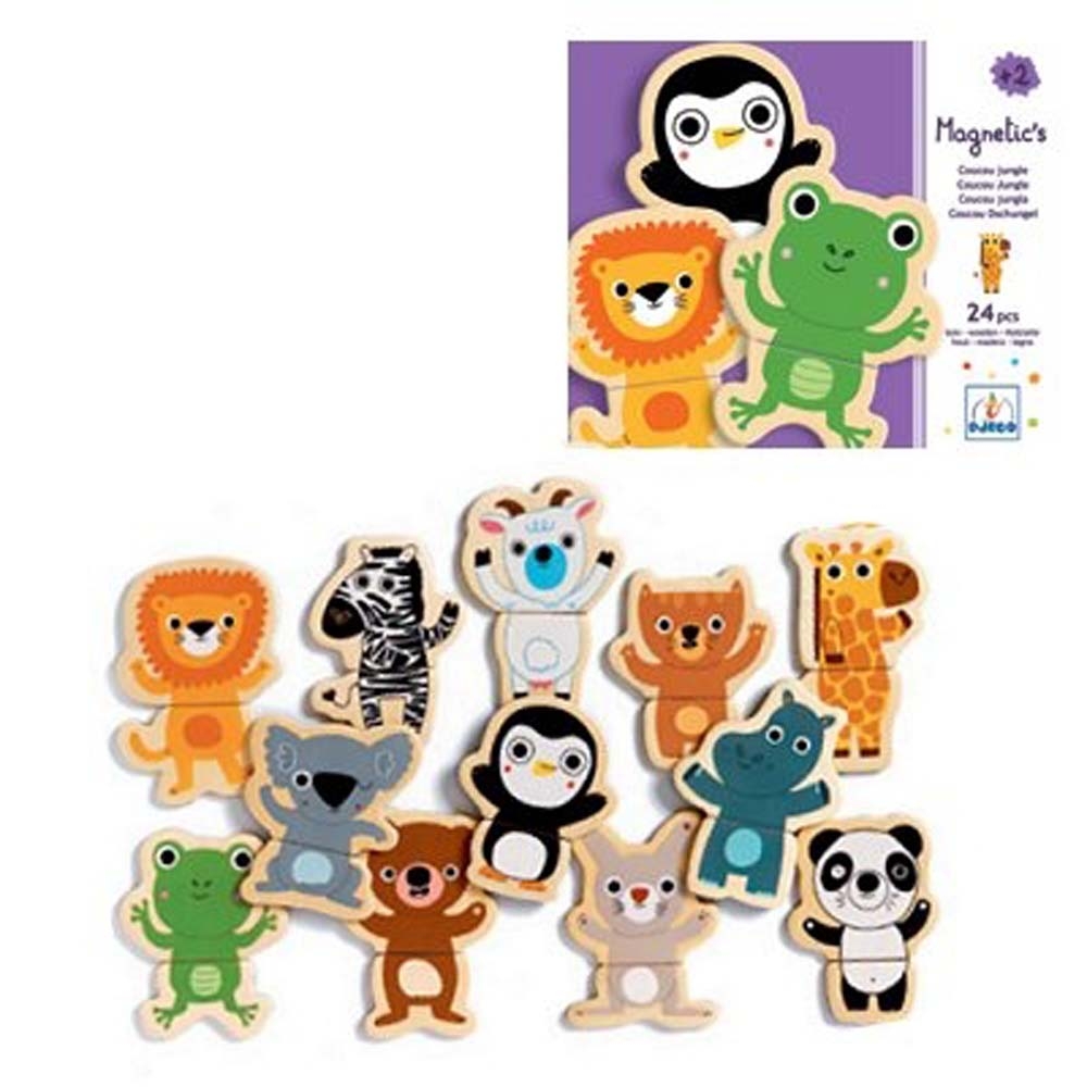 Avec les 24 pièces en bois, recrée les animaux magnétiques en assemblant le haut et le bas du corps de chacun.