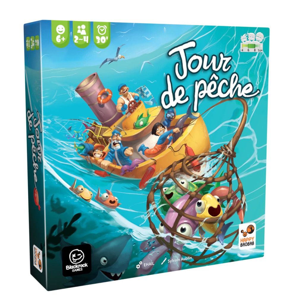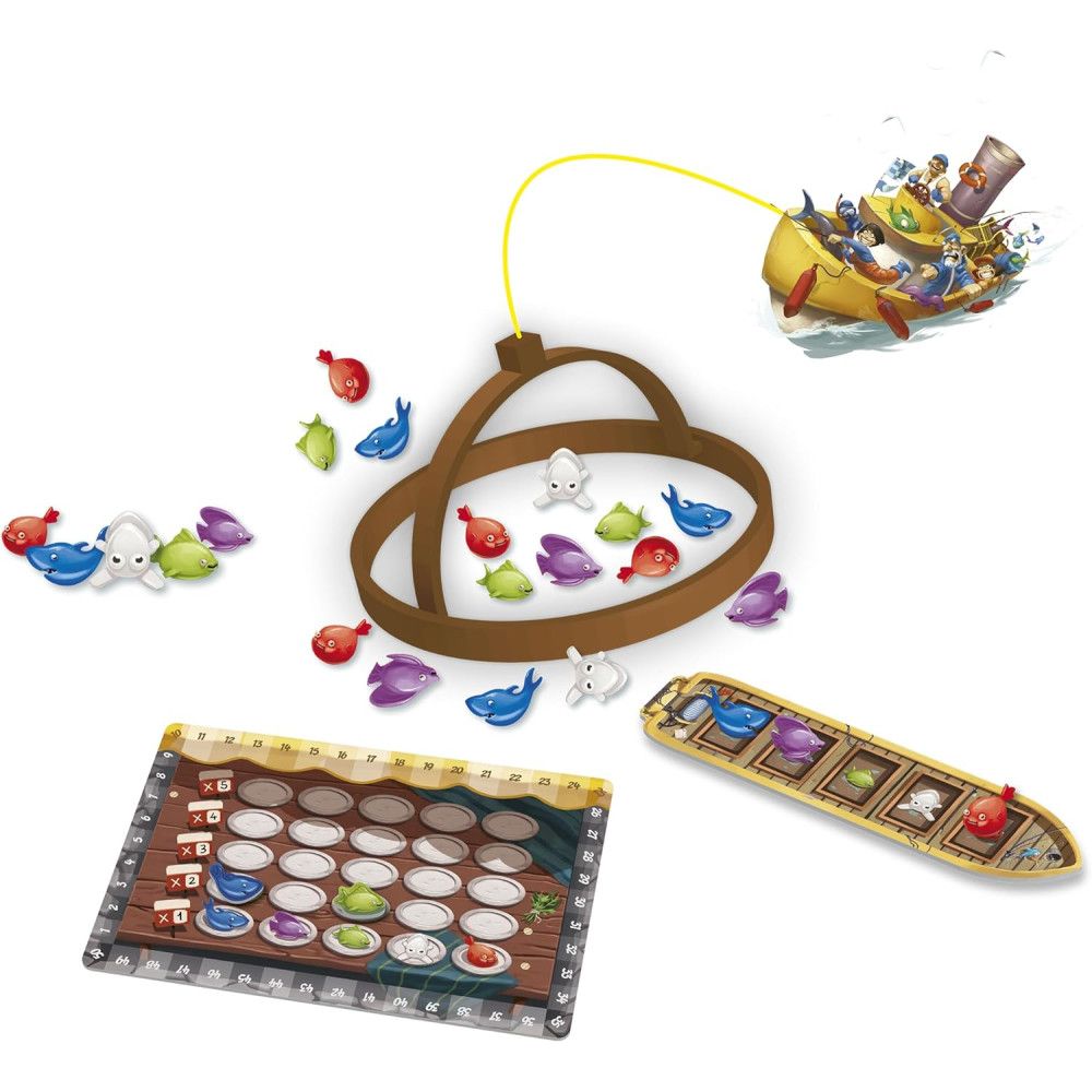- Contenu : 60 poissons, 20 jetons Poisson, 4 filets, 4 bateaux, 4 Jetons Ancre, 1 canne à pêche, 1 plateau Marché et 1 livret de règles