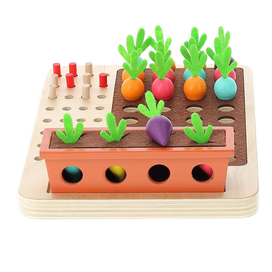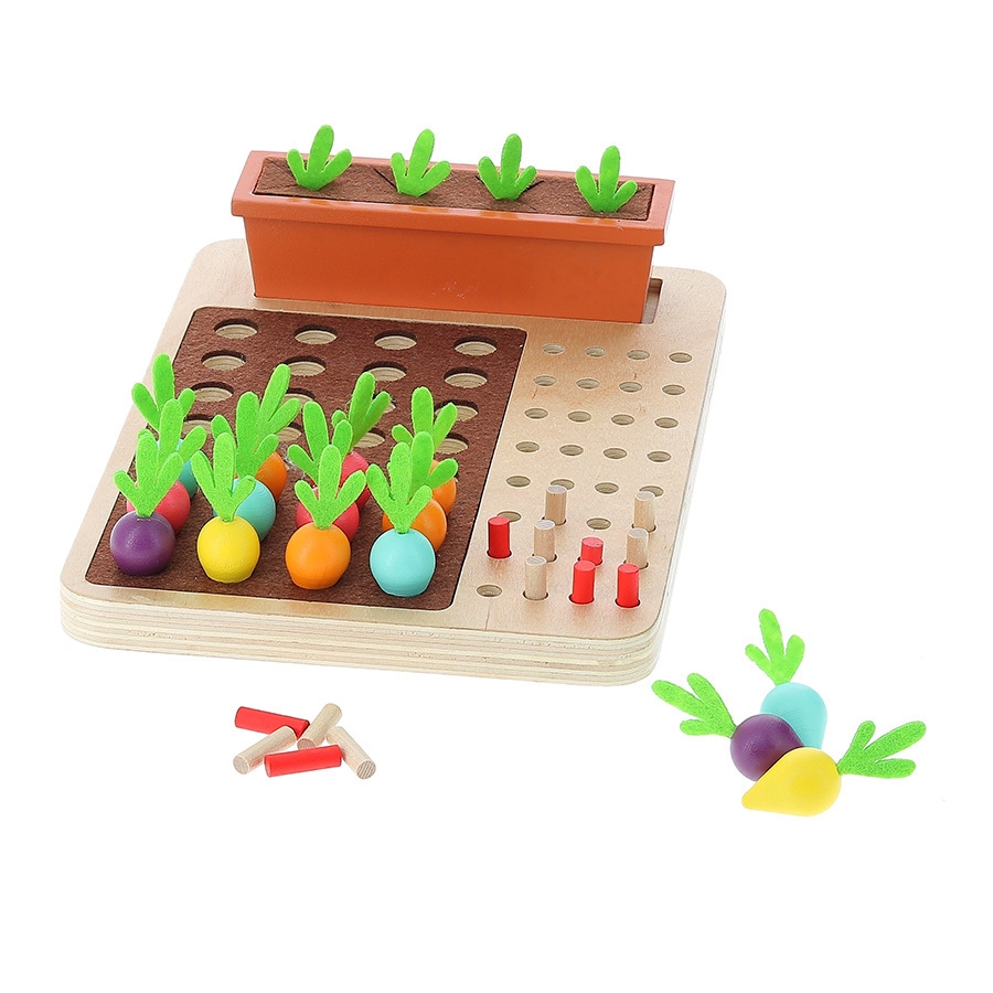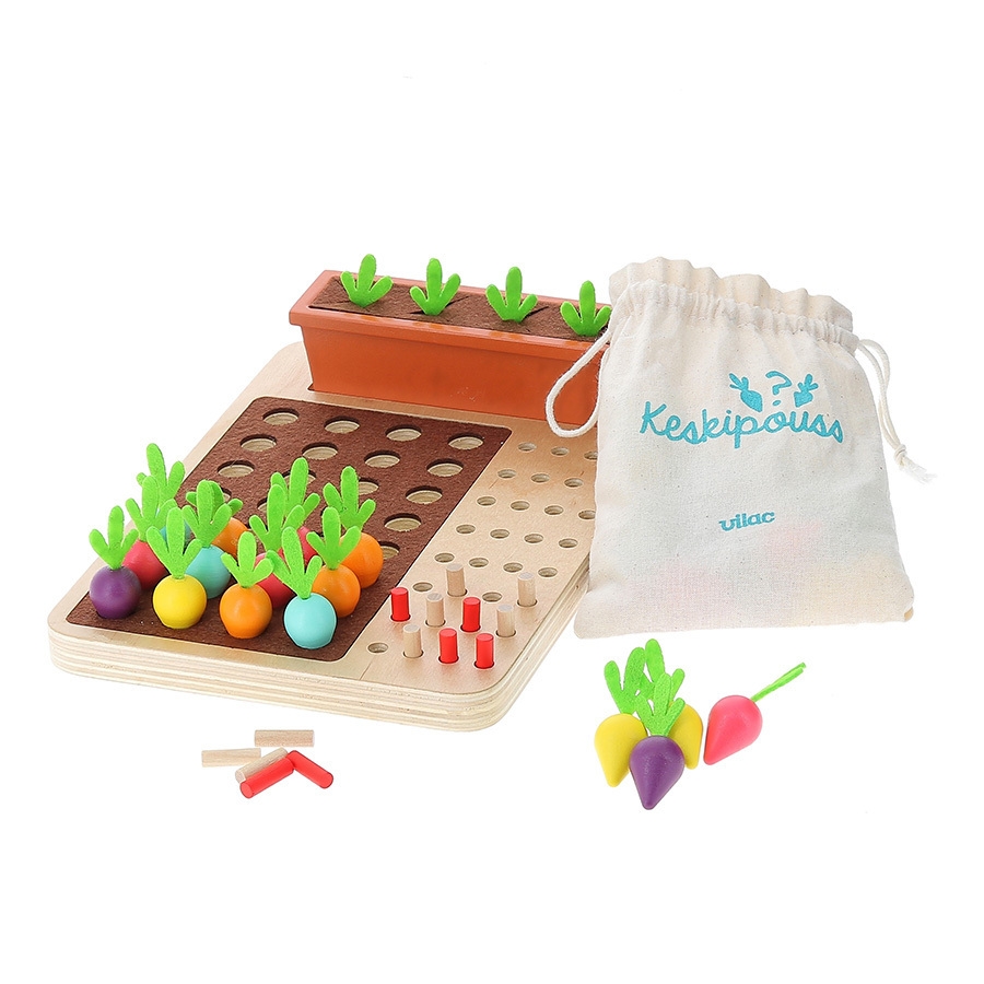 Contenu : 1 plateau de jeu, 1 jardinière en bois, 40 pièces en bois peint et feutrine, 40 petites tiges en bois et un sac de rangement en coton.