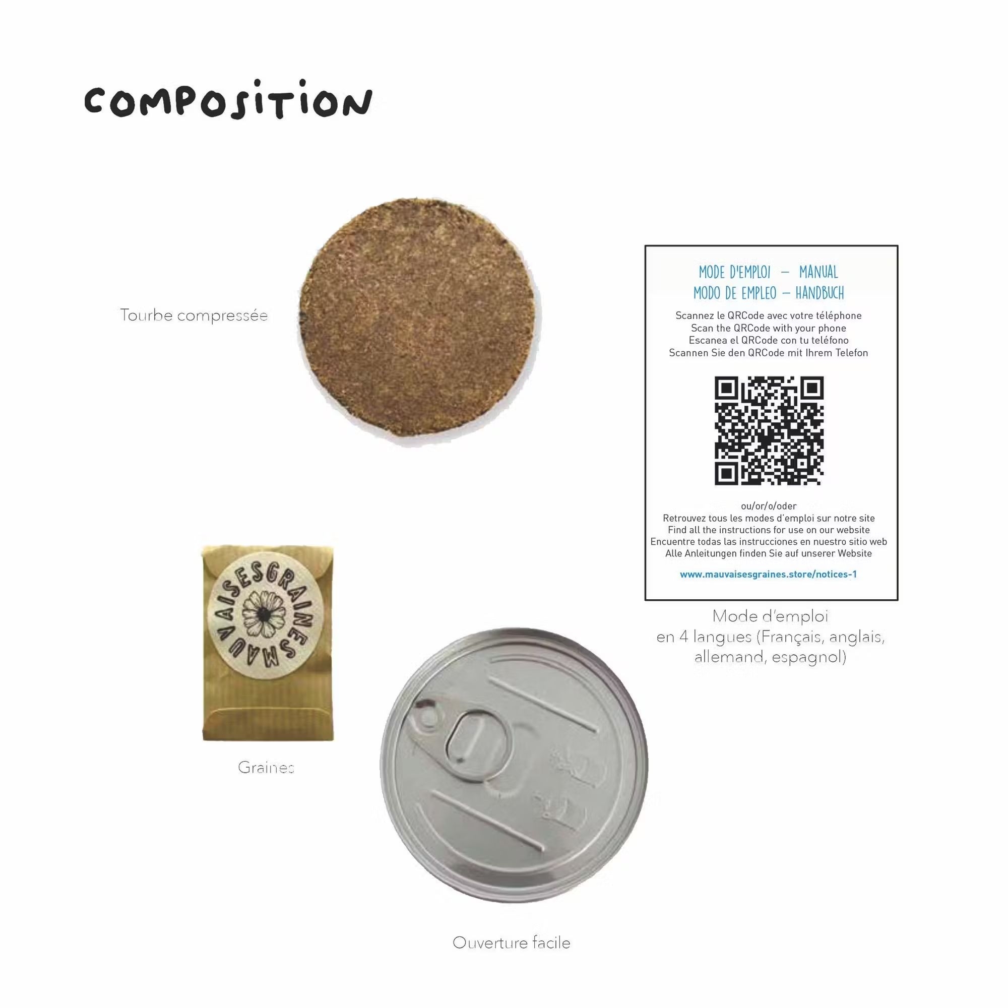 Contenu : boîte avec ouverture facile, tourbe compressée, sachet de graines