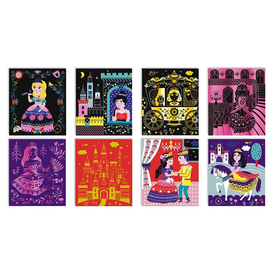 Il suffit de gratter les silhouettes pré-tracées pour voir les princesses et leurs décors s'animer de couleurs !