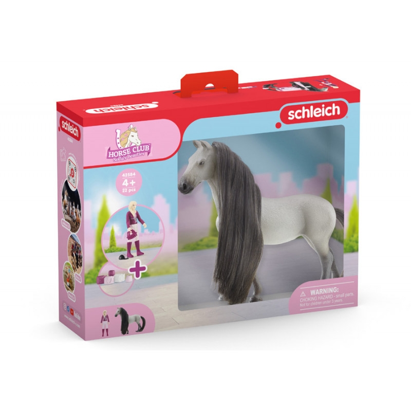 Contenu : 1 Jument Trakehnen avec crinière et queue qui peuvent être peignées, 1 figurine Sofia entièrement articulée, 1 couverture pour cheval, 1 bombe, 1 lot de pinces à crins, 1 lot de perles à crins, 1 mèche à crins à clipser, 1 brosse.