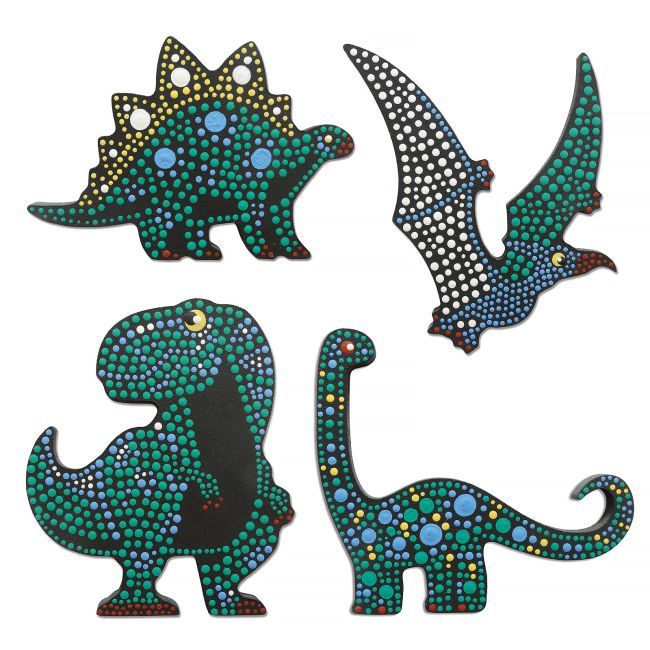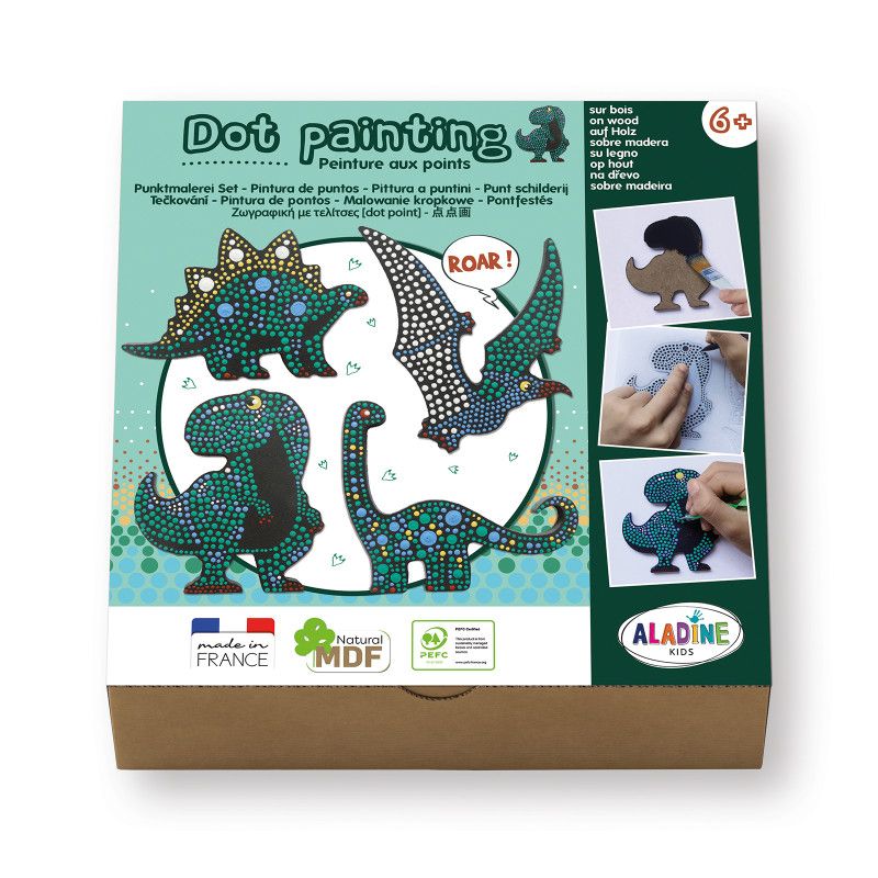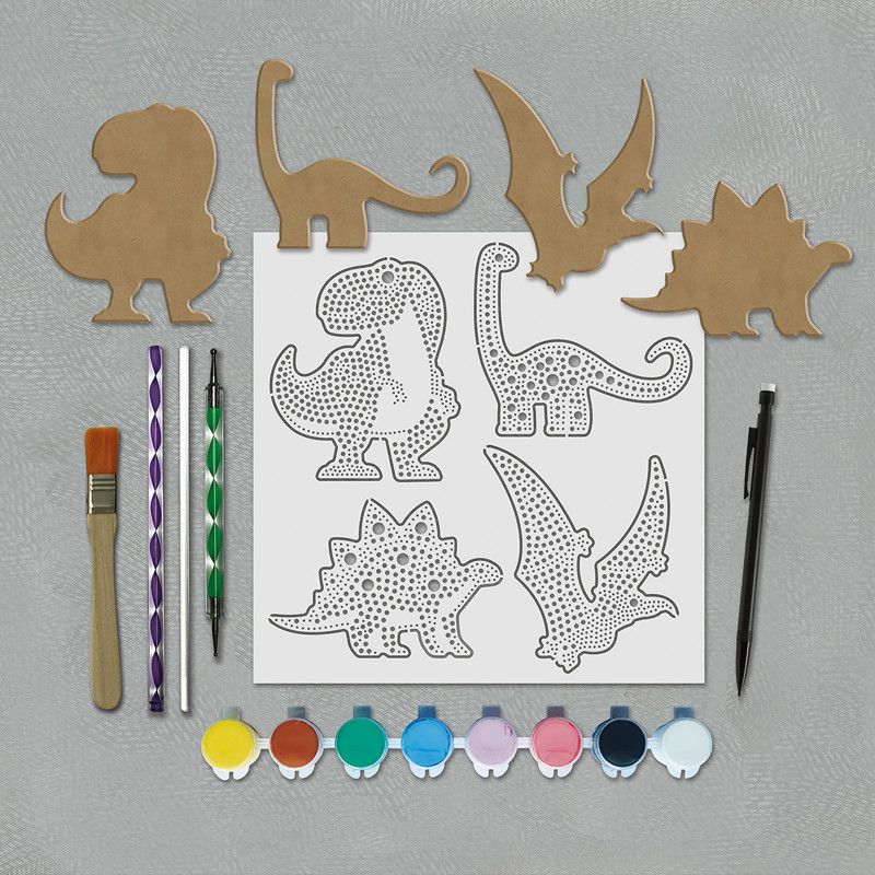 Contenu : 4 formes en MDF Dinosaures, un pochoir, 8 petits pots de peinture, 3 bâtonnets à embouts plats et double pointe, un pinceau et un porte-mine.