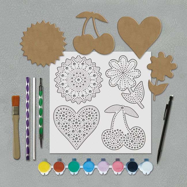 Pour décorer les formes en bois fournies, il suffira à l'enfant de les peindre d'une couleur unie (le noir permettra de faire ressortir toutes les couleurs), de laisser sécher, puis, une fois bien sec, d'appliquer le pochoir et de tracer les points au crayon