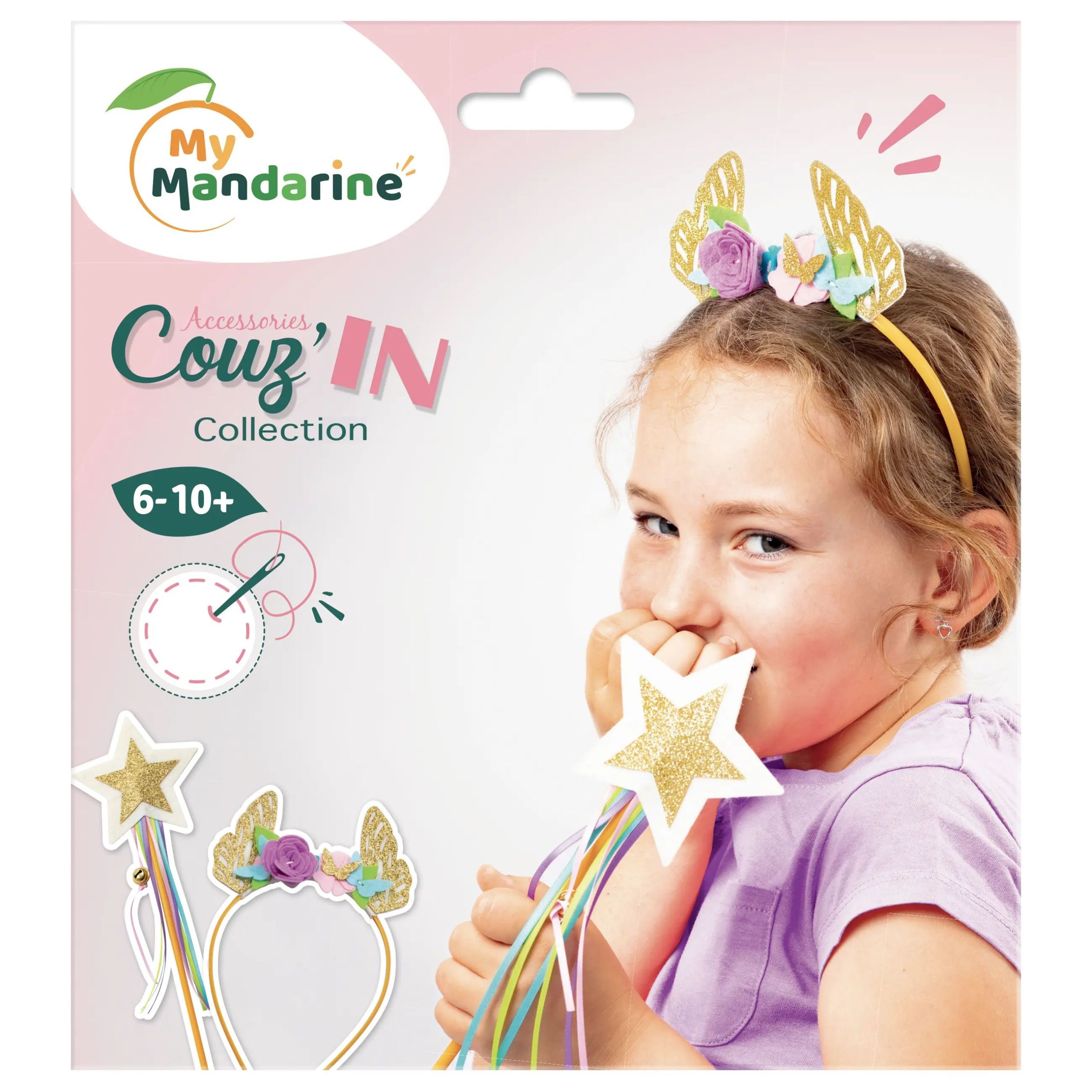 - Contenu : 1 serre-tête et une baguette magique, éléments de feutrine prédécoupés (pré-trouée ou adhésive), du fil, 1 clochette, des rubans, 1 aiguille plastique, et une notice.