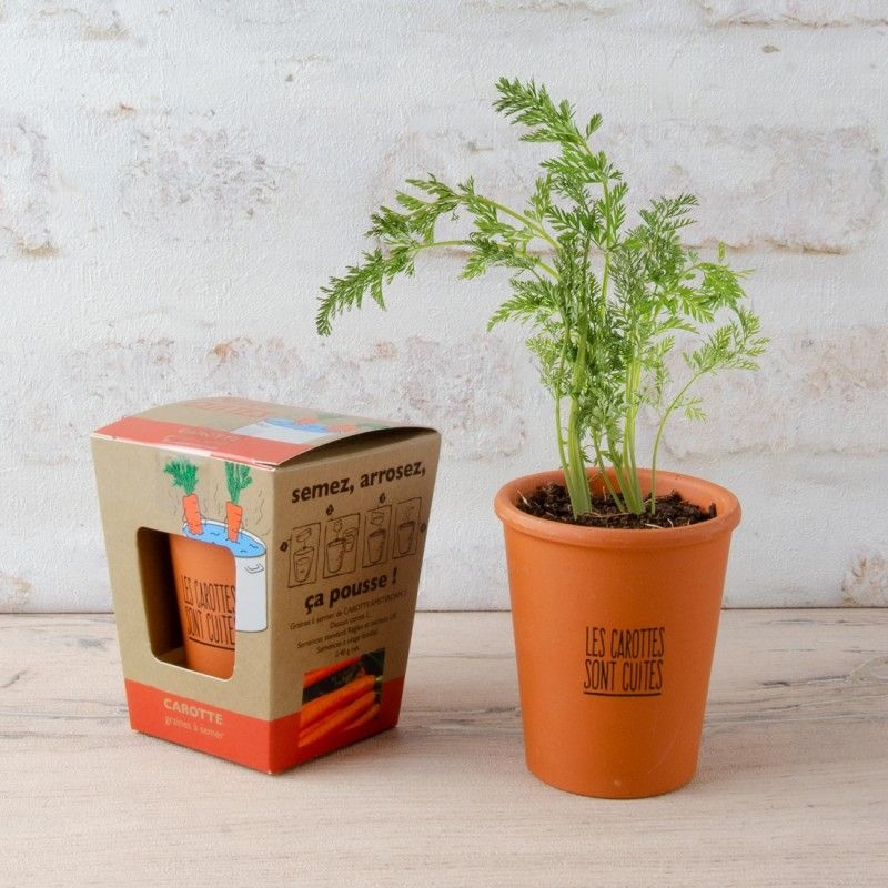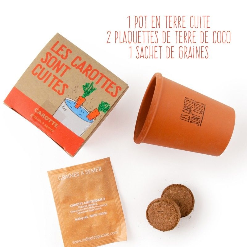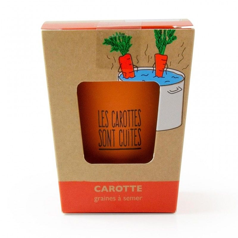 Quand tout est fichu, quand il est trop tard, reste l'humour pour dédramatiser la situation. Ce kit de semis et son message « Les carottes sont cuites » fournit tout le nécessaire pour un semis de carotte courte.