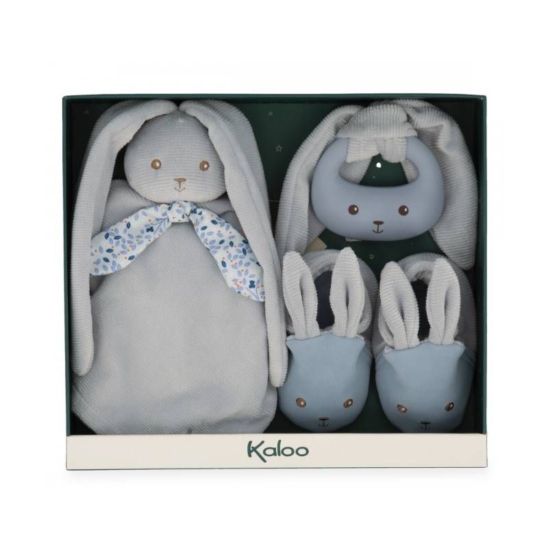 Offrez ce superbe coffret cadeau de naissance de chez Kaloo, contenant 3 indispensables spécialement conçus pour bébé. Ce coffret comprend un doudou lapin, un anneau de dentition en silicone et de charmants chaussons lapin.