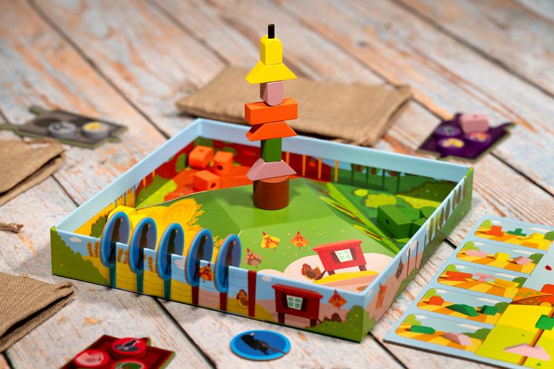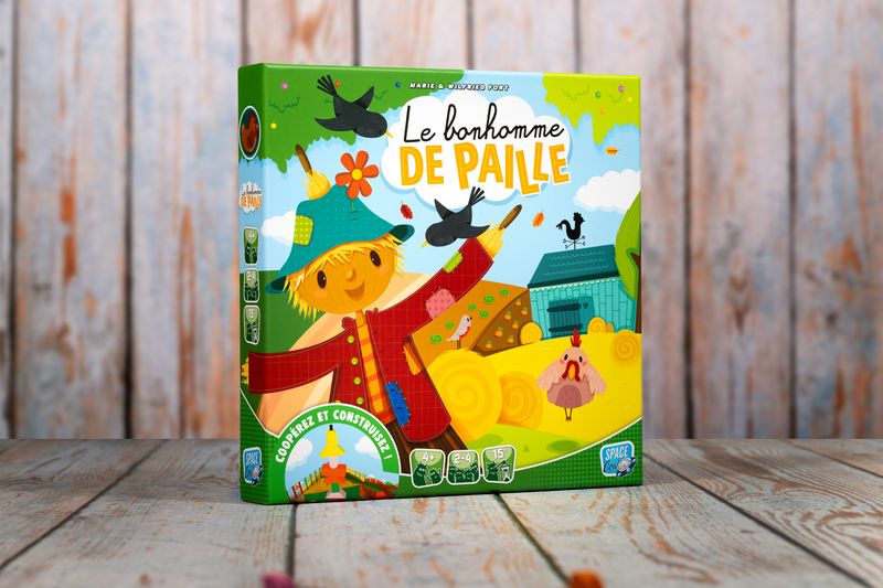Contenu : 4 plateaux Brouette, 22 pièces en bois, 6 tuiles Oiseau, 20 jetons en bois, 4 sacs, 1 plateau Épouvantail, 14 cartes Épouvantail et 1 livret de règles