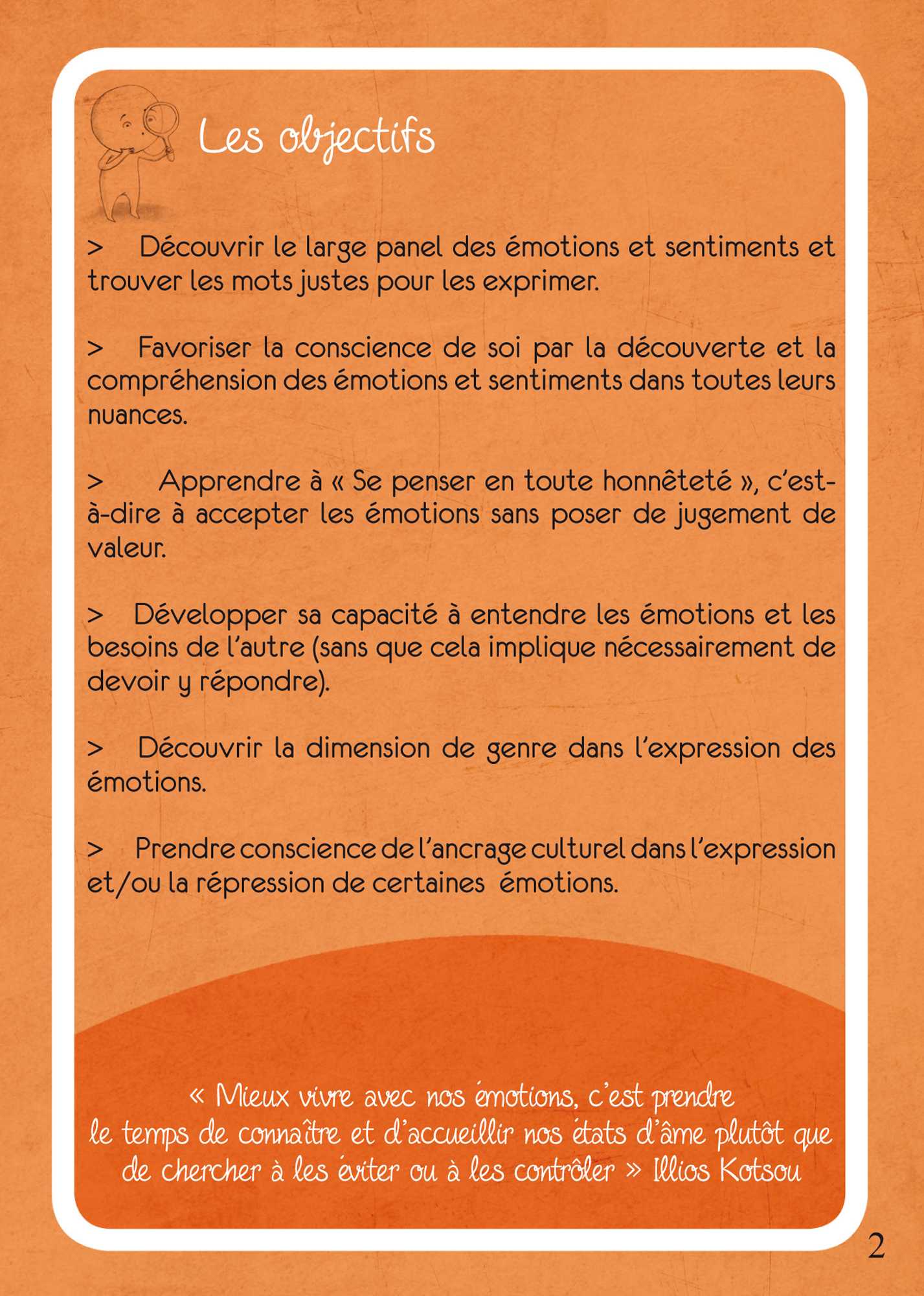 Les émotions sont des réactions intimes de notre personne. Leur reconnaissance et leur expression - dès le plus jeune âge - favorisent une meilleure compréhension de soi et de l'autre et, à plus long terme, un meilleur ancrage dans le monde dans lequel nous vivons. Pour petits et grands, garçons et filles, sages et moins sages… A explorer individuellement, en couple, en famille, en classe ou en travail d'accompagnement