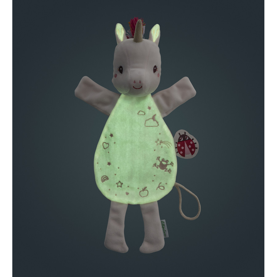 Glissez vos doigts dans les bras et derrière la tête de la licorne, et votre doudou se transforme en marionnette. De quoi divertir votre tout-petit et partager de chouettes moments de complicité !