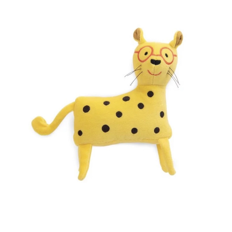 Un petit léopard au pelage tacheté en velours jaune tout doux. Lunettes rouges sur le nez et longues moustaches, il est tout sourire et facile à saisir. Dans son ventre se cachent de petites billes qui font du bruit quand on l'agite.