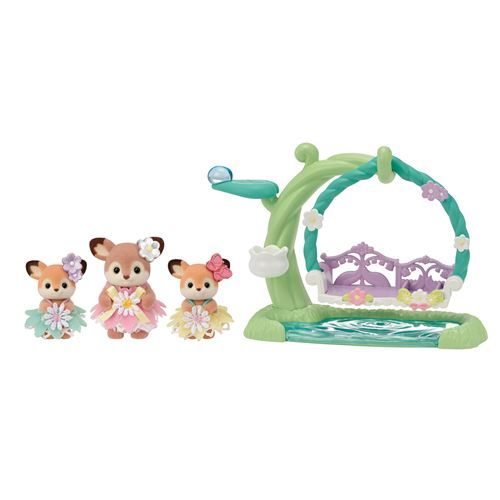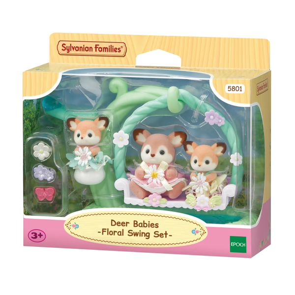 Le set Les bébés Biche et balancelle des Sylvanian Families contient les bébés biche dans leurs robes à fleurs assorties, une balancelle avec deux balançoires et un petit berceau. Les bébés Sylvanian peuvent porter des accessoires en forme de fleurs et de papillon à leur oreille disponibles en trois coloris différents : blanc, violet et rose.