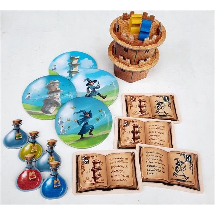 - Contenu : 4 plaques, 1 donjon, 9 tours, 8 sorts, 90 cartes mouvements, 24 sorciers, 36 fioles, 1 dé, 1 bouclier Oya et la règle du jeu