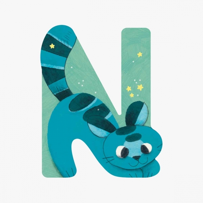 Lettre N en bois, illustrée avec un chat pour décorer la chambre de bébé ou composer un joli abécédaire. Lettre facile à prendre en main pour se familiariser avec l'alphabet. Cette lettre se décline en 2 coloris (orange et bleu).