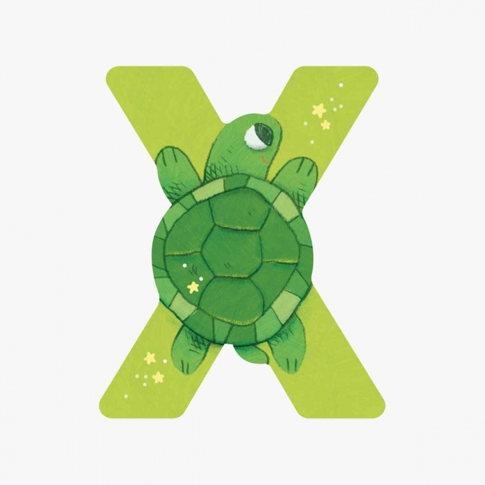 Lettre X en bois, illustrée avec une tortue pour décorer la chambre de bébé ou composer un joli abécédaire. Lettre facile à prendre en main pour se familiariser avec l'alphabet.