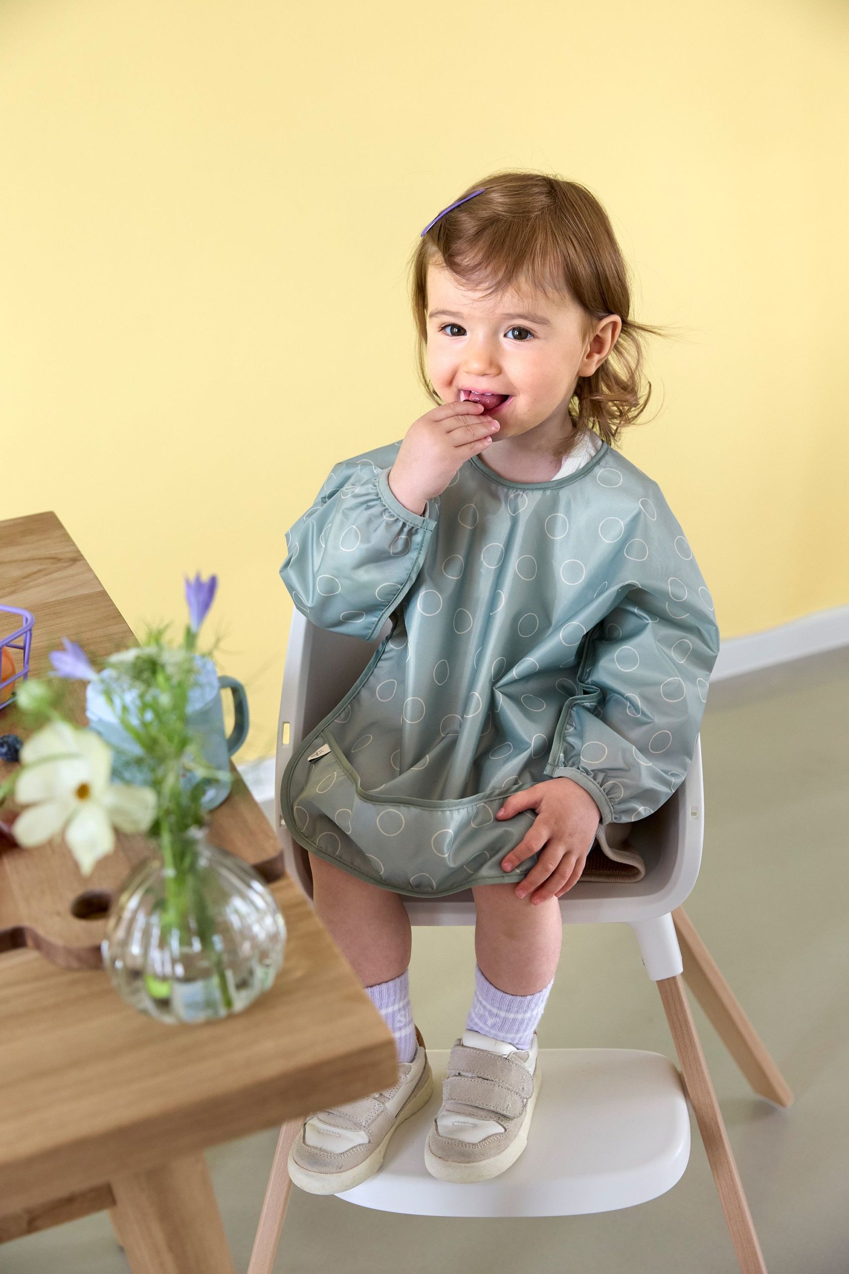 Les petits peuvent donc s'adonner librement à des activités artistiques, ou savourer leurs repas, sans craindre de se salir, car leurs vêtements restent propres et secs, grâce aussi à la poche ramasse-miettes.