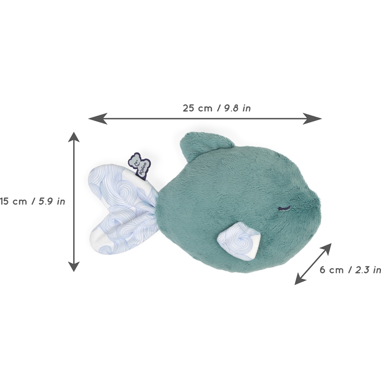La douceur de la fourrure sur la partie avant contribue à la relaxation. L'imprimé « vagues » orné de poissons brodés sur la partie arrière et les nageoires rappelle le calme des profondeurs sous-marines. Votre bébé pourra aussi bien utiliser ce poisson sans la poche comme peluche câline ou avec la poche comme bouillotte. La chaleur apaisera ses douleurs et la lavande l'aidera à s'endormir grâce à ses propriétés calmantes et apaisantes.