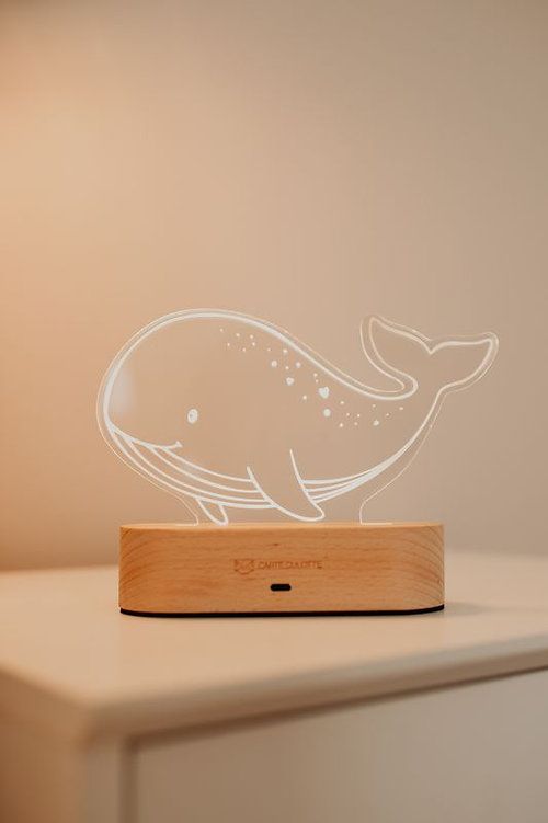 Bien plus qu'une lumière, offrez une lumière douce et poétique avec cette veilleuse baleine : la veilleuse est évolutive, car vous pouvez changer le modèle visuel selon l’ambiance souhaitée. Une sieste, un lapin, une nuit, une girafe ou un petit lion… Chaque silhouette transforme la lumière et l’atmosphère de la pièce. Son socle en bois naturel intègre une base LED chaleureuse, sur laquelle vient se poser un joli petit compagnon. Ici, c'est Nilo, une adorable petite baleine.