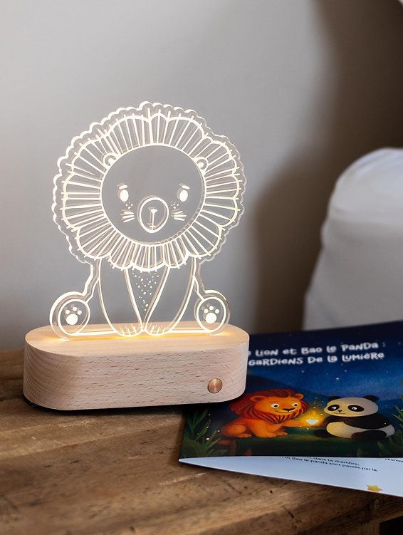 Bien plus qu'une lumière, offrez une lumière douce et poétique avec cette veilleuse baleine : la veilleuse est évolutive, car vous pouvez changer le modèle visuel selon l’ambiance souhaitée. Une sieste, un lapin, une nuit, une girafe ou un petit lion… Chaque silhouette transforme la lumière et l’atmosphère de la pièce. Son socle en bois naturel intègre une base LED chaleureuse, sur laquelle vient se poser un joli petit compagnon. Ici, c'est Léo, une adorable lion.
