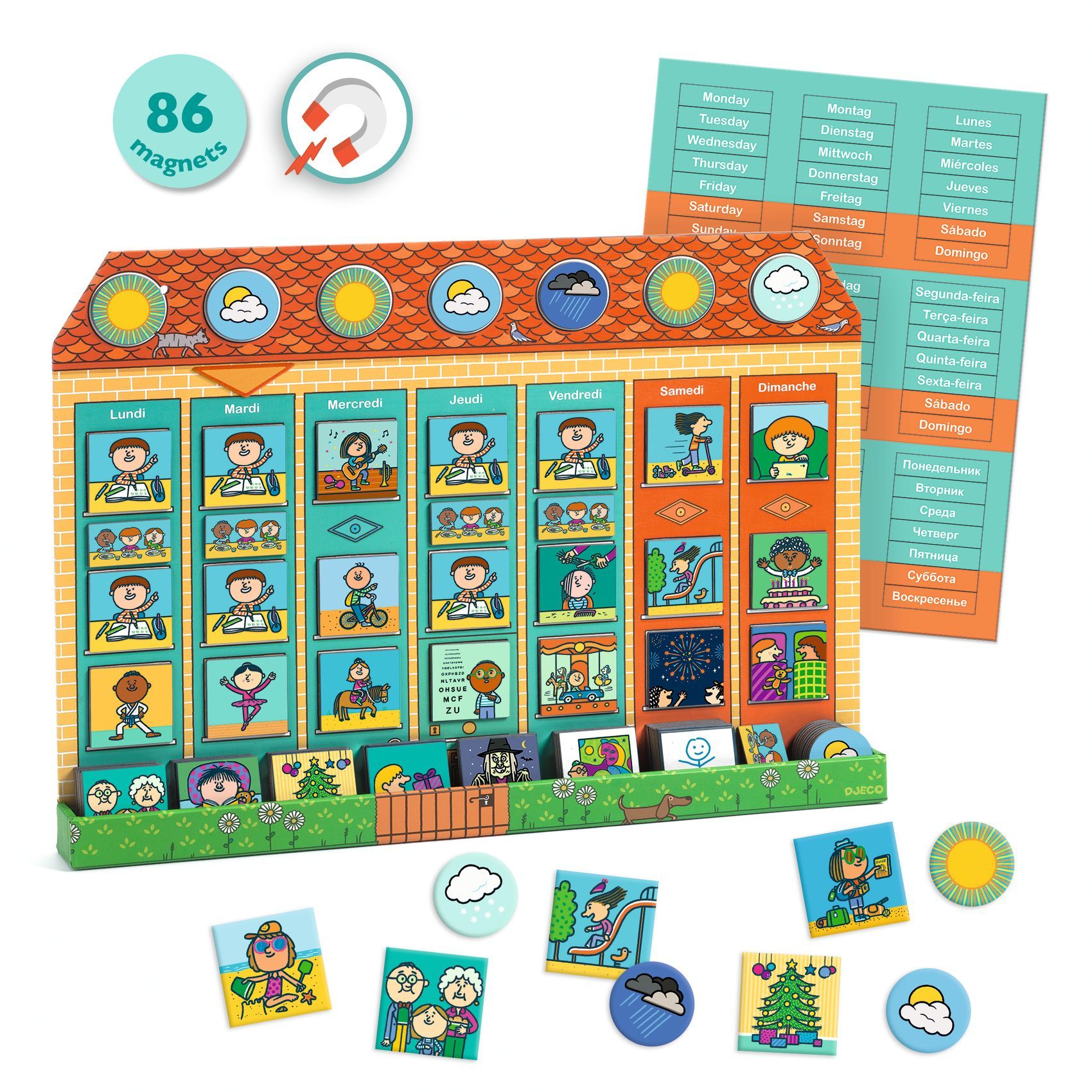 Contenu : 1 tableau-maison magnétique géant, 86 aimants, 1 planche de stickers prédécoupée avec les jours de la semaine en 4 langues, 1 livret