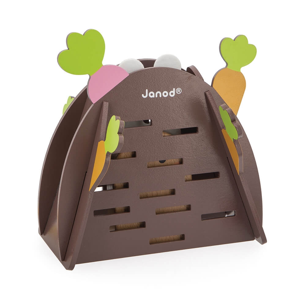 - Contenu : 1 terrier, 1 lapin en bois et feutrine, 12 carottes en bois de couleurs différentes et 1 dé en bois