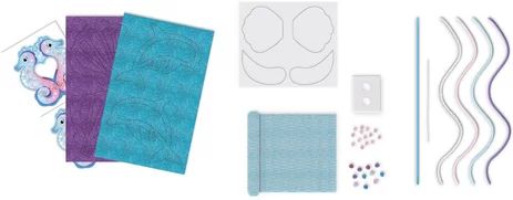 Contenu : 2 planches de papiers à effets brillants prédécoupés et autocollants, 1 planche de papier imprimé prédécoupé et autocollant, 1 feuille transparente, 1 ruban de sequins nacrés, 3 rubans de satin, 2 demi-perles nacrées, des sequins coquillages et 3 baguettes en bois teinté