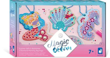 Découvrez le coffret créatif porte-clés à diamanter de la collection Magic Ocean de Janod, une activité de diamond painting sur le thème océan.