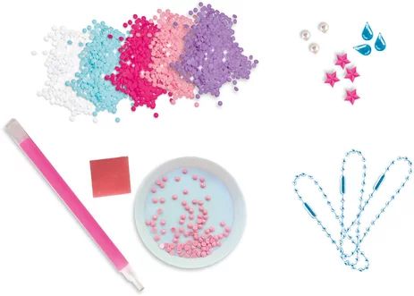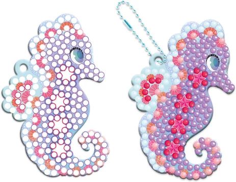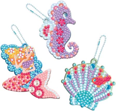 Votre enfant s'amusera à réaliser de superbes porte-clés en plaçant des mini-strass à l'aide de l'outil. Il réalisera une sirène, un hippocampe et un coquillage. De magnifique porte-clefs à offrir ou à accrocher à son sac ou son cartable.