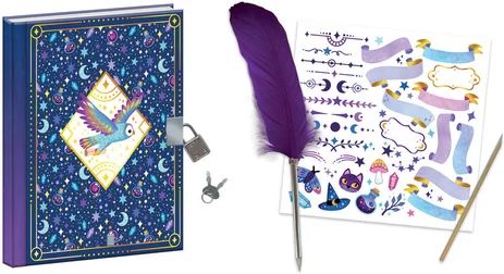 Contenu : 1 carnet secret, 1 cadenas, 2 clefs, 1 planche de décalcomanies pour décorer son carnet et 1 stylo à encre violette