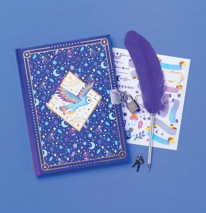 Un accessoire de papeterie accompagné d'un superbe stylo à encre violette en forme de plume. Votre enfant pourra personnaliser chaque page de son carnet grâce à la planche de décalcomanies incluse.