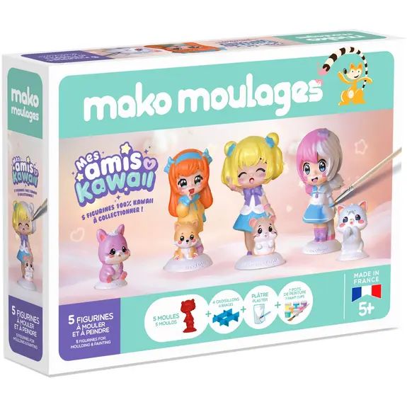 - Contenu : 5 moules en latex (3 personnages et leur mini animaux + 2 moules chibi), 1 sachet zippé refermable de 800g de plâtre, 1 cuillère doseuse, 7 pots de peinture gouache girly de 5 ml, 4 croisillons, 1 pinceau, 1 notice d'utilisation.