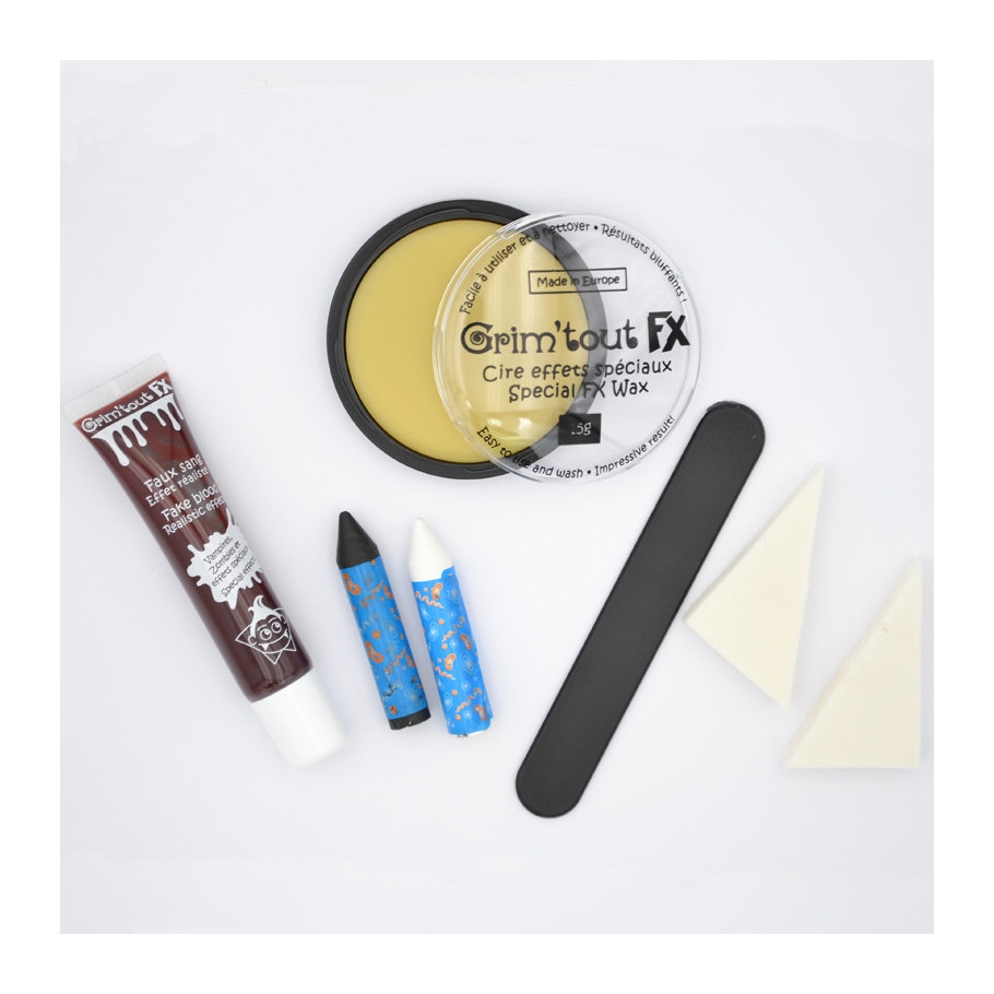 Contenu : de la cire 15 ml, 1 spatule, un tube de faux sang 15 ml, 2 éponges et 2 crayons de maquillage