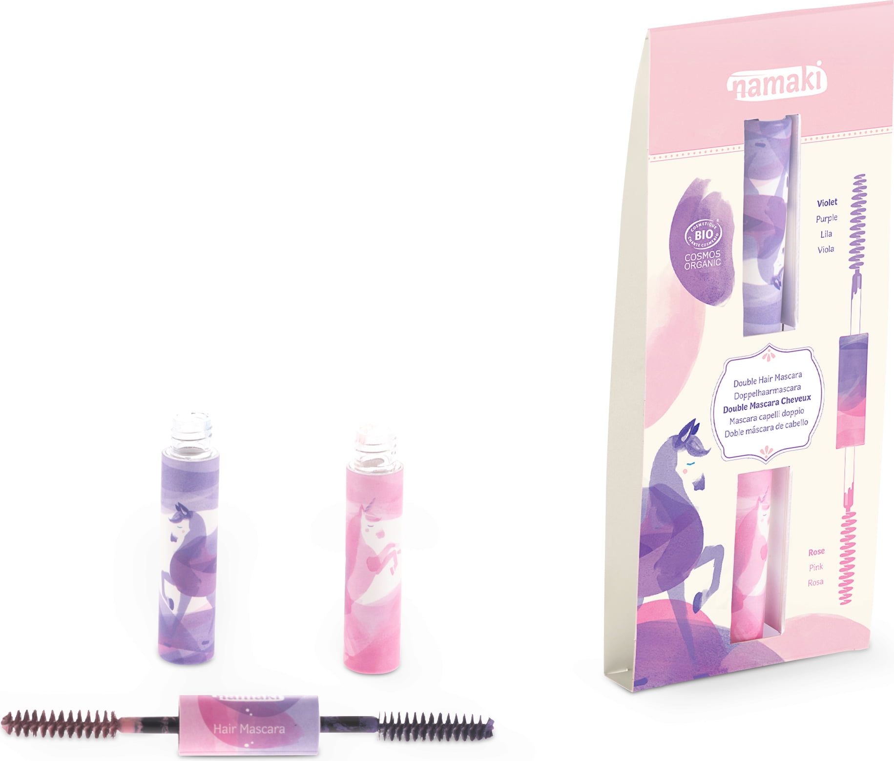 Ce double mascara pour cheveux, rose et violet, est facile à appliquer et s'enlève sans difficulté au shampoing.