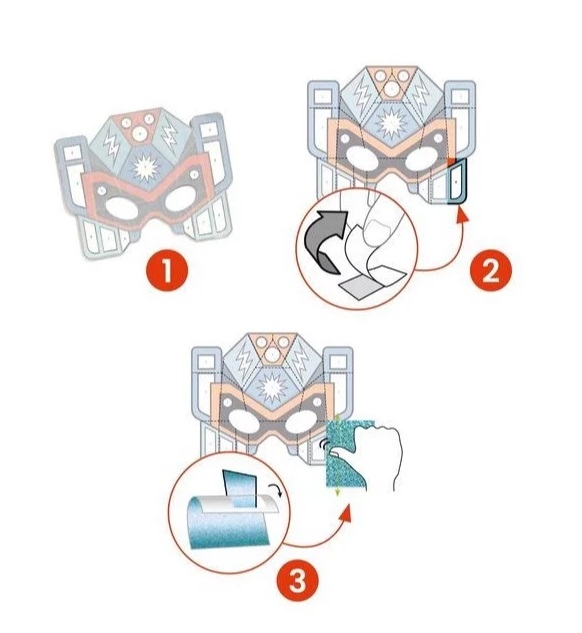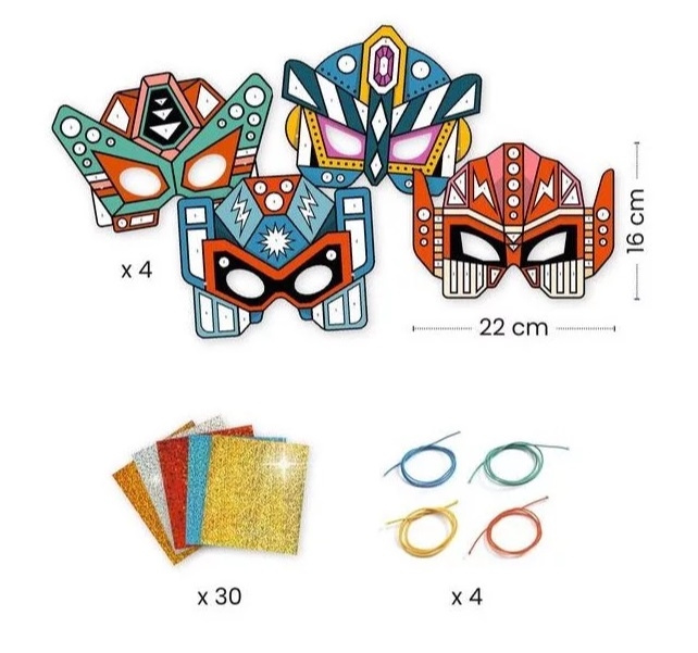 Grâce à ce coffret Do It Yourself de Djeco, décore 4 masques sur le thème des robots à l'aide de feuilles de métal de couleurs sur les zones adhésives prévues à cet effet.