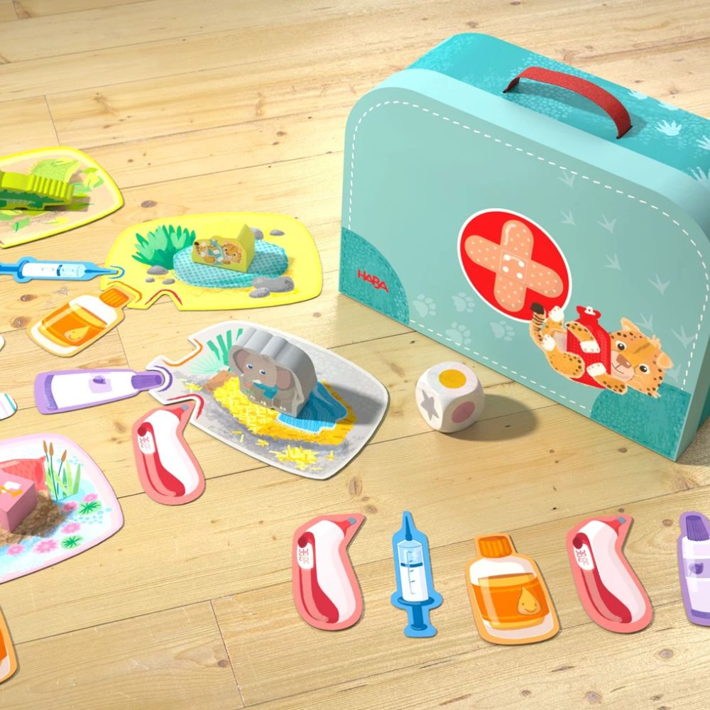 Aïe, aïe, aïe, les animaux sont malades ! Il faut vite les soigner : le crocodile souffre d'une rage de dents, l'éléphant est enrhumé, le guépard a des maux de ventre et le flamant rose s'est cassé la patte. Prends la mallette de vétérinaire pour soigner les animaux.
