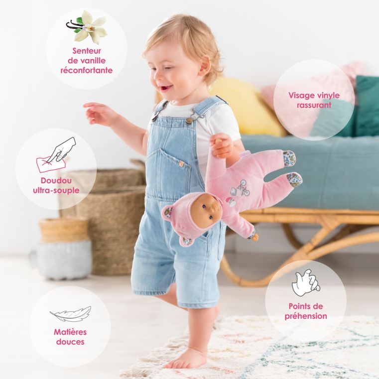 Son corps souple sans billes est léger et facile à saisir. Sa tête et ses mains, à la délicate senteur de vanille, sont en vinyle doux au toucher. Sa toile de corps est douce pour l'éveil des sens. Elle est non amovible.