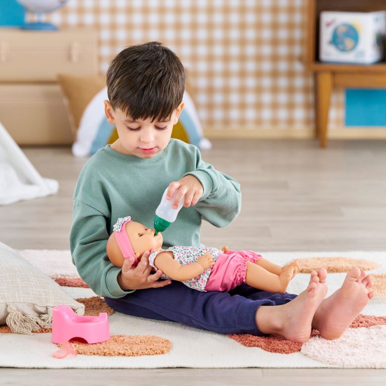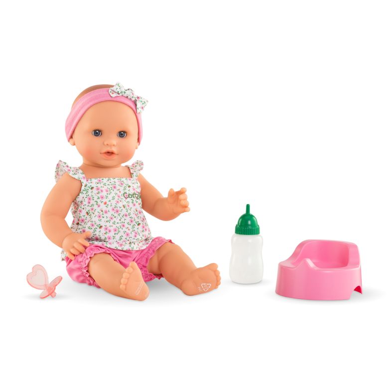 Ce grand poupon Corolle boit son biberon qui peut être rempli d'eau, fait pipi « pour de vrai » sur son pot lorsqu'on lui appuie sur le ventre